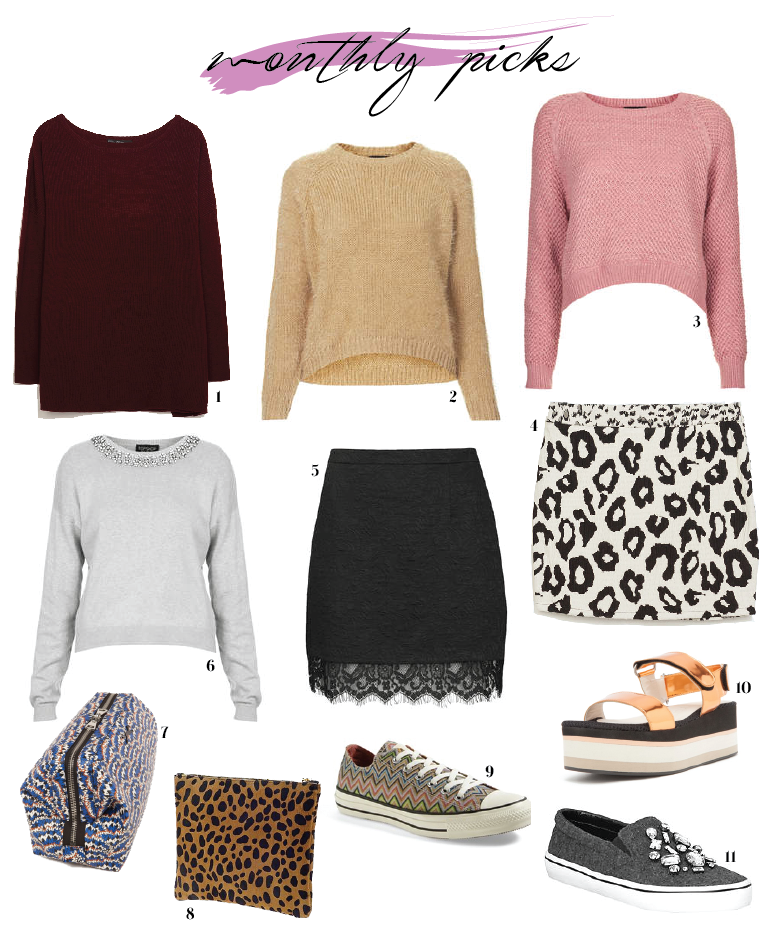 This monthly picks can be seen in previous posts (here). Again, they’re kind of fall-y picks but this year I’m (also) craving for fall. The collections are so beautiful and I just want to wear it all. Do not forget to enjoy these last days of summer but also start preparing your closet for the months to come. I used to think that fall and winter were boring because it would look like you were wearing always the same thing. But this past year, I can surely say I evolved a bit and started being creative with my clothes – trying on patterns, not being afraid to mix them, give bright coloured clothes a chance. I don’t have a wide imagination when it comes to picturing some things, so when it comes to clothes, I always have to try them to see how they look. Needless to say I have days when all I do is try on clothes to figure out what I’m wearing the rest of the week. I’m dying to try the Topshop jumper and lace skirt that are coming to my closet soon!