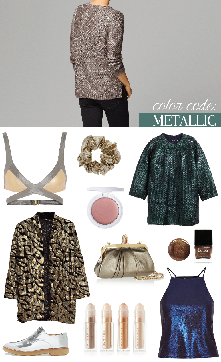 Metallic Finish Blucher from Zara, Fantasy V-Neck Structured Sweater from Massimo Dutti, Liquid Metallic Cami,