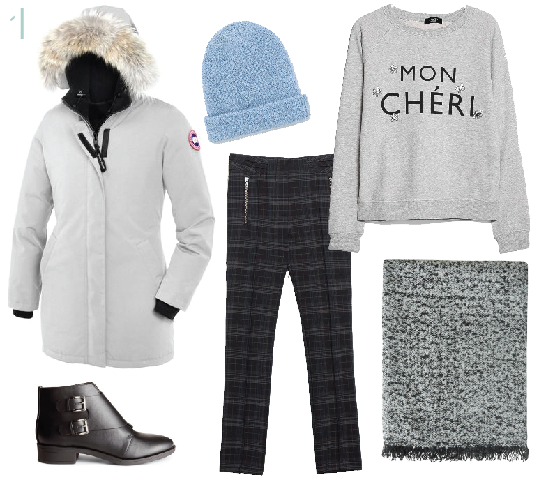1. Victoria Parka from Canada Goose, Checked Trousers with Piped Waist and Knitted Hat from Zara,