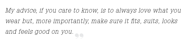 My advice, if you care to know, is to always love what you wear but, more importantly, make sure it fits, suits, looks and feels good on you. There’s nothing more enchanting than being comfortable and, when we’re not, it’s highly noticeable.